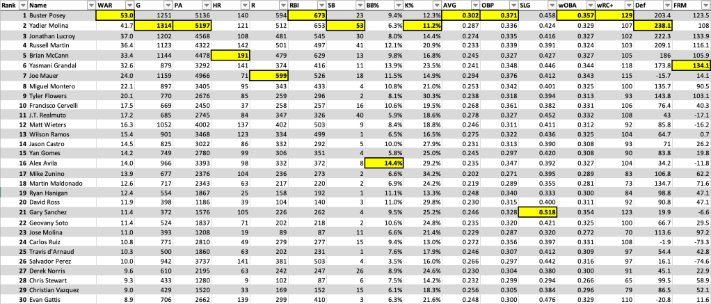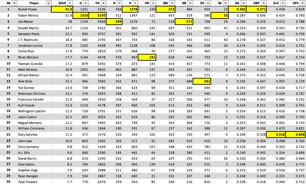 Posey ranks first among catchers in a number of conventional statistical categories such as runs batted in (RBI), batting average (BA), and on-base percentage (OBP), as well as more advanced metrics like weighted on-base average (wOBA) and wRC+. He also has an MVP award and three rings to his name in the last decade. On top of all this, he was the second-best player in all of baseball from 2010-2017 according to Fangraphs WAR. The only player better than him over that time frame was Michael Nelson Trout (duh). So you wouldn’t be remiss to argue that not only has Posey been the best catcher of the past 10 years but also one of the best players in all of baseball.