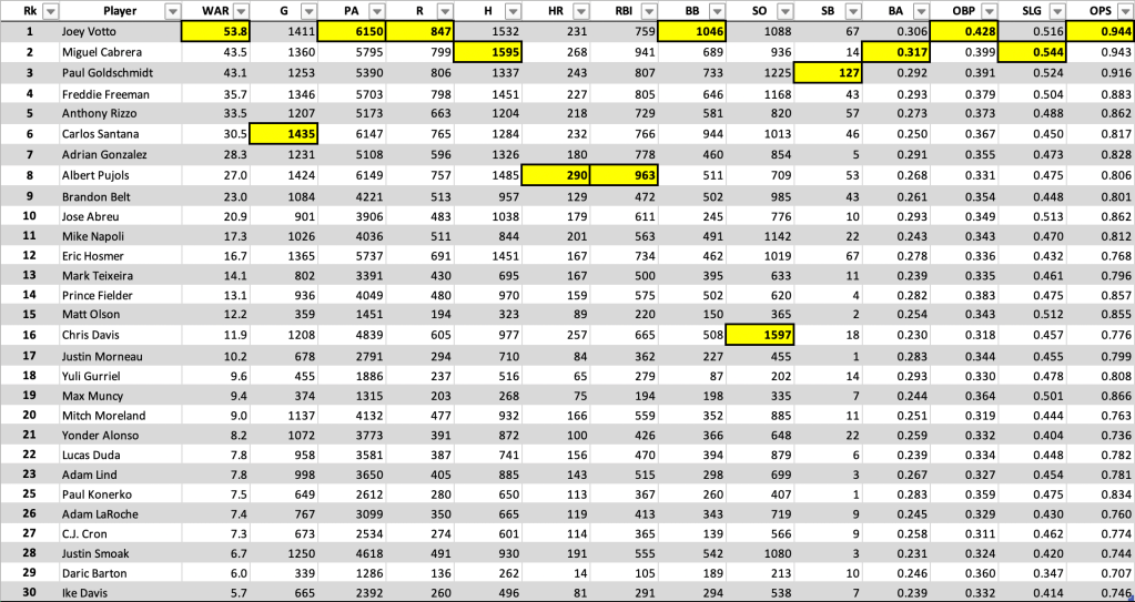 The two top first basemen over the past decade were unquestionably Joey Votto and Miguel Cabrera. I’ll start with Votto, who topped both the Fangraphs and Baseball Reference WAR charts for first basemen by a healthy margin.