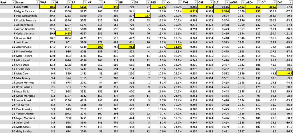 That’s the list. There are only 120 players in history that have even walked 1000+ times, let alone people that did it in a 10-season span. He didn’t quite hit for as much power as any of the other first basemen on the list but he is a master of safely reaching base, which he did more frequently than any other player in the last decade. At the end of the day, avoiding an out is probably the best outcome a player can have and Votto did that best in the 2010s.