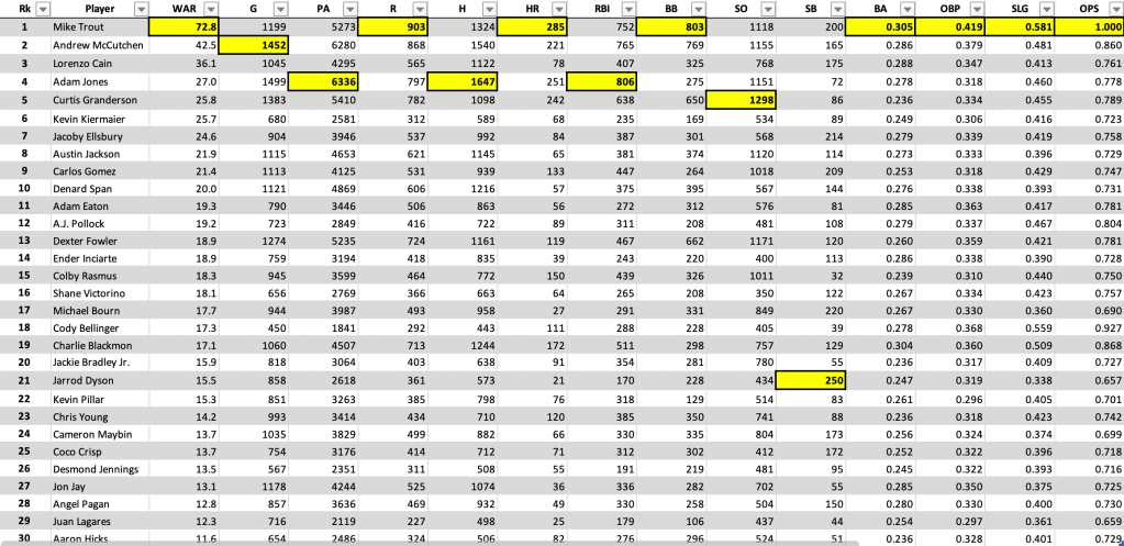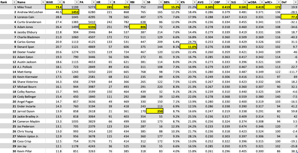 Last but not least, Ender Inciarte has been a defensive force for the Braves and Diamondbacks during his career. My brother insists that he is blow average which, offensively, he is, but on defense he is seventh in rWAR among center fielders since 2010. Not too shabby. And definitely not below average.