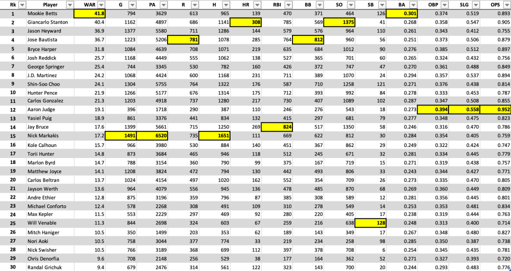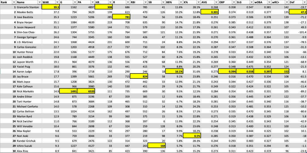 Opening Day for most teams is tomorrow, so we’ll finish up a look at position players of the 2010s with right fielders today.